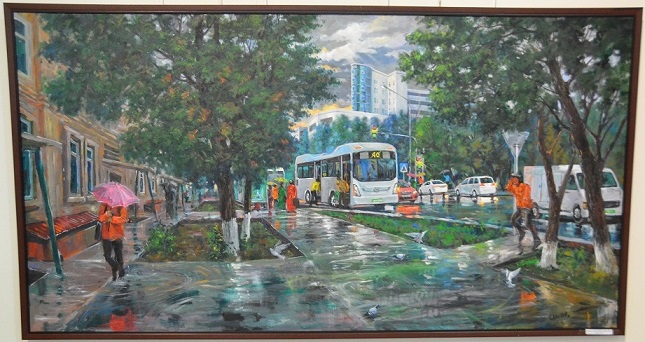 Свой стиль, свой почерк наблюдается у Куллыева Довлетгелди, студента 3 курса. Его картина, рисующая дождливый день, написана легко и свободно и пленяет каким — то особым изяществом, очарованием. Чувствуется дыхание времени, ее ритм, и в то же время неспешное течение жизни. Один миг выхвачен из будней столицы, а сколько в нем глубины. И высотные здания, уходящие под облака, и поток машин, и голуби, привольно гуляющие рядом с людьми на тротуаре, весь этот ландшафт современности, увиден не только глазами разума, но и глазами души. Потому и такой ясный свет идет от картины.