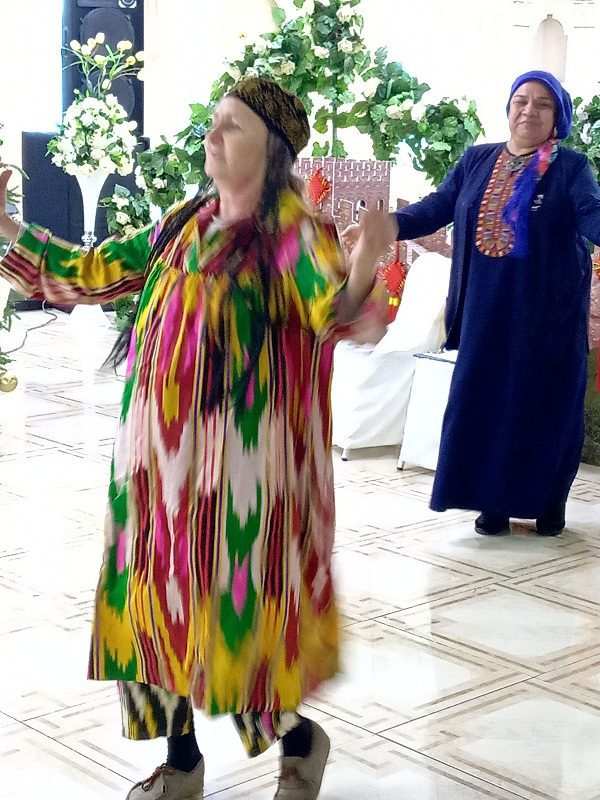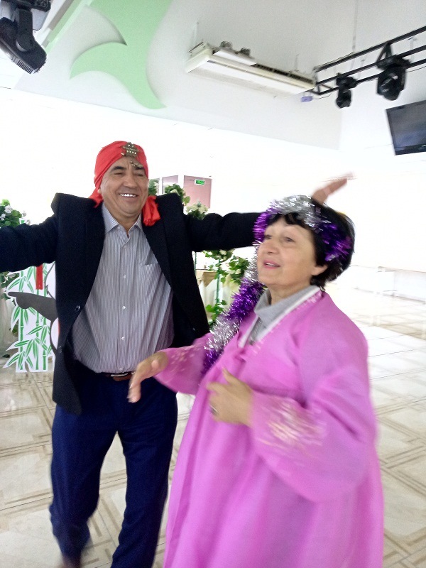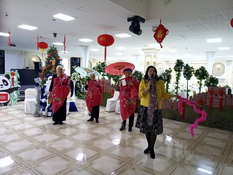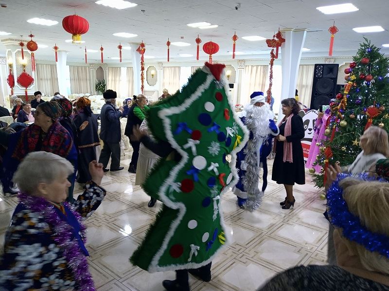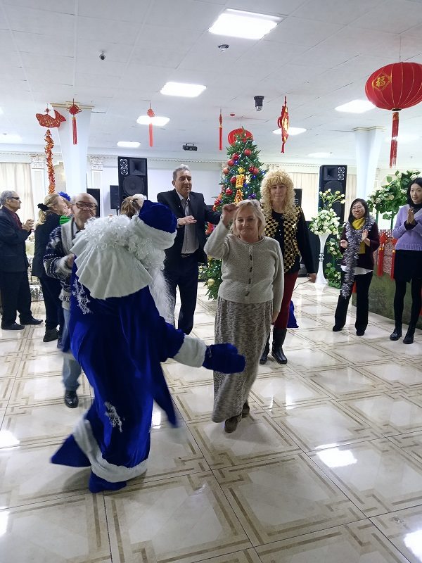 Какой же Новый год без Деда Мороза?! Все участники праздничного действа хором пригласили главного традиционного персонажа всех новогодних мероприятий. Поздравив всех, Дед Мороз тут же пригласил желающих поиграть в известную с детства игру «Стульчик». Взрослые с удовольствием бегали вокруг стульев, смеялись, от смеха путали стулья. Было весело. И это все под веселую, ритмичную музыку. Читали стихи. Было много музыки, танцев, танцпол не пустовало. Можно сказать, что взрослые люди, как дети, забавлялись и предавались веселью. Исполняя импровизированный китайский танец, дамы надели китайские наряды. Для зажигательного узбекского танца «Лязги» исполнительница нарядилась в традиционное узбекское платье из ткани «шайи», а сарафан и кокошник украсили даму, вышедшую танцевать русскую плясовую. А мужчины для потехи надели женские платки. А одна парочка под песню «Кайфуем» под общие аплодисменты станцевала жаркий танец.