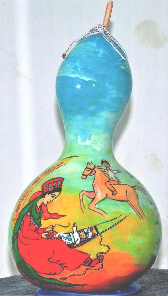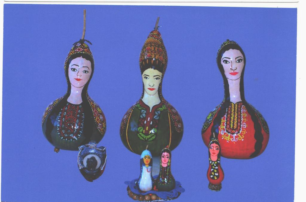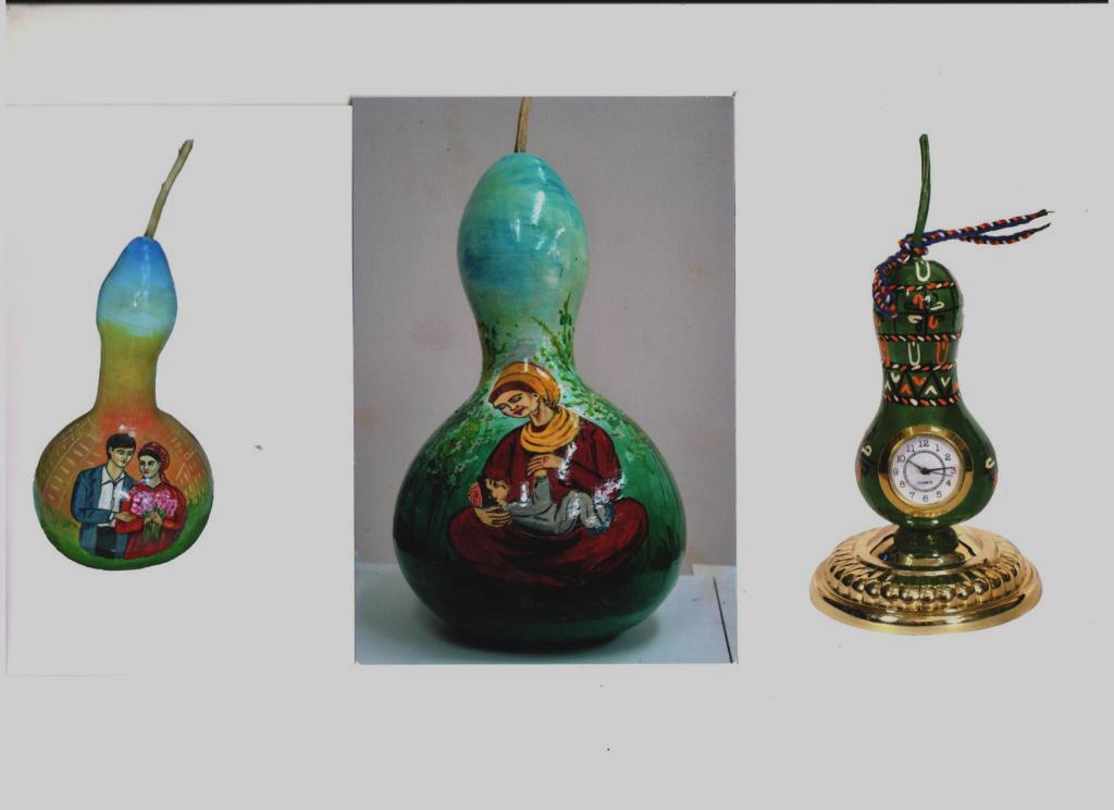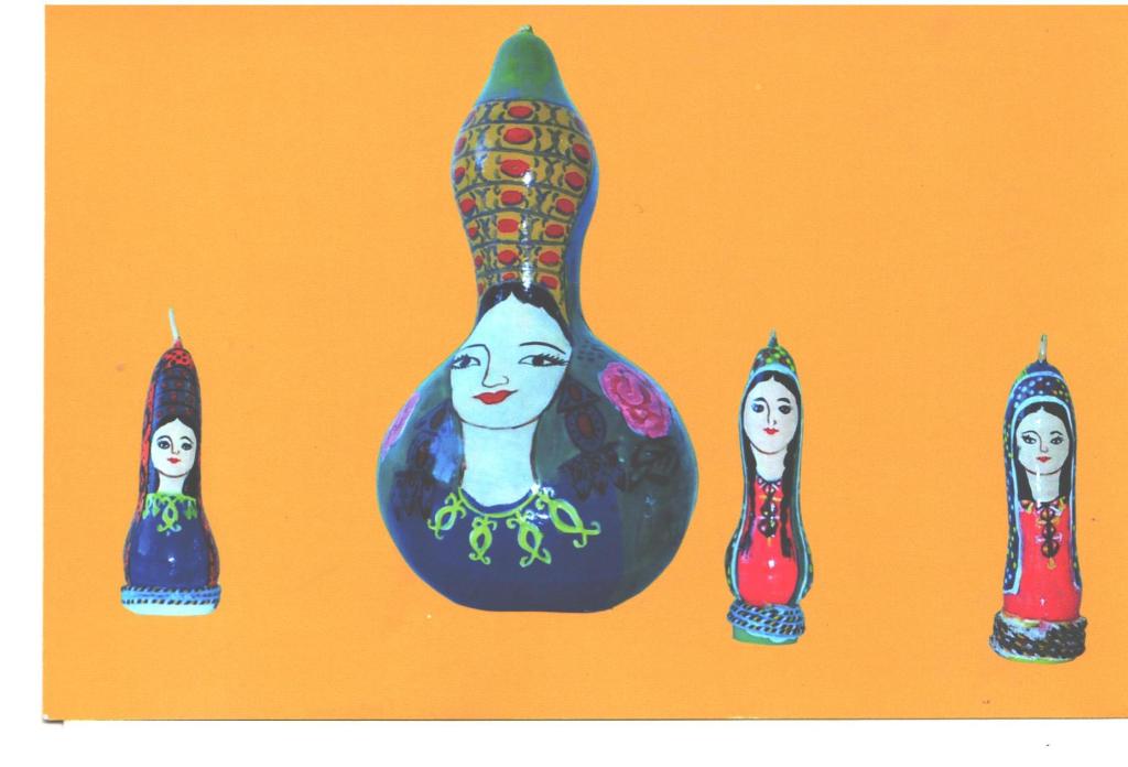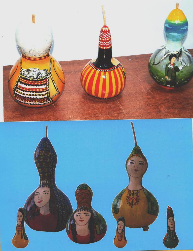 There is an acquaintance of mine living in Ashgabat Dovletnepes Soyunov, an amateur artist. He works in the structural unit of the capital’s municipality– “Ashgabatteplo” (central heating institution) and has been painting the dried fruits of decorative pumpkin varieties for five years. The master says that in total he created about two hundred works. The hollow, hard-edged inedible “berries,” as all pumpkins are called, are transformed with a brush and the artist’s fantasies into gray-bearded old men, Turkmen gelins (brides) dressed in the national outfit. You can find attractive plot drafts as well. For instance, a caravan (camels) gliding along the ocean of sand, led by an experienced caravanbashi (leader of the caravan) guide, green meadows – open space for the faithful helper of the shepherd – Alabai dog. Pumpkins of a special form are painted for money boxes, chests, lamps, watches, and vessels for storing bulk food products.