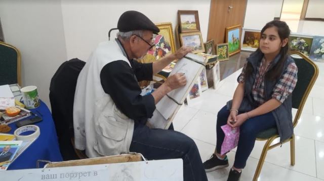 У этого художника нет недостатка в желающих получить от него портрет на арт — базарах, проводимых в помещении торгово — развлекательного центра «Багтыярлык». Там же он выставляет иногда и свои картины.