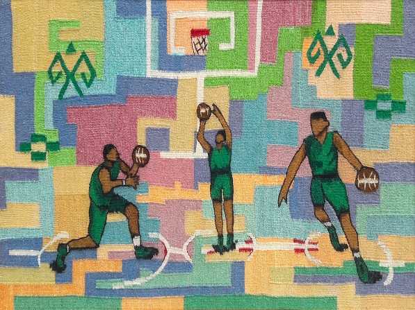 Türkmenistanyň amaly-haşam sungatynyň çeper aýratynlygyny özleşdiren ýaş halyçylar, zergärler, keramikaçylar sportuň dürli görnüşlerini haşam dili arkaly suratlandyryp, täze taslamalary döredýärler. Amangeldi Hojaberdiýewiň “Tennis”, Jeren Rahmanberdiýewanyň “Sport”, Şeker Guwanjowanyň “Basketbola taýýarlyk”, Şirin Guwanjowanyň “Ýeňil atletika”, Begenç Gurbanmuhammedowyň “Tans sporty” atly gobelenlerinde dürli geometrik şekilleri umumylaşdyrylyp dokalan türgenleriň sudurlary bilen sazlaşykda görkezilen.