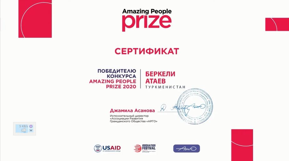 от всей души поздравляю со столь знаменательным событием и благодарю за организацию такой нужной площадки, как Конкурс гражданских инициатив «Amazing People Prize!» В гражданском обществе я уже 10 лет и, в этом юбилейном году принял решение участвовать в конкурсе. Мне очень приятно, что инициатива Веб сайт InAshgabat — платформа гражданского общества набрала рекордное количество голосов за всю историю участия туркменских НПО в конкурсе, начиная с 2017 года!